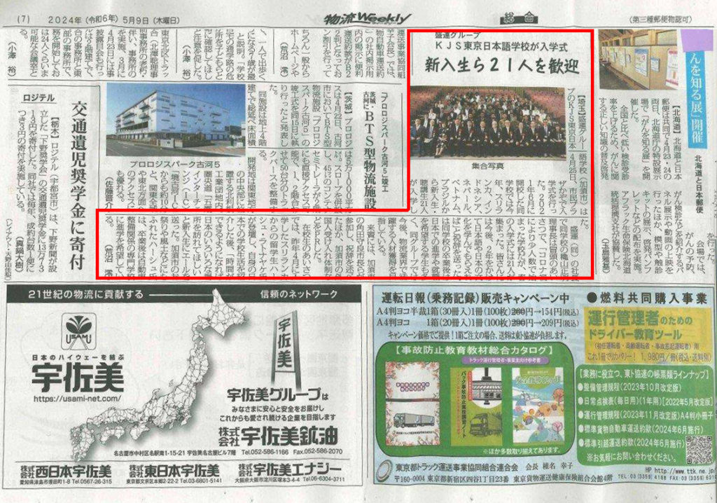 5月14日(火)発行の物流ニッポンに弊社社長が理事長を務めるKJS東京日本語学校の5期生の入学式の記事が掲載されました。
